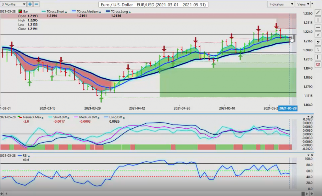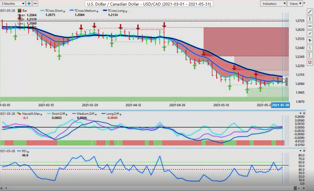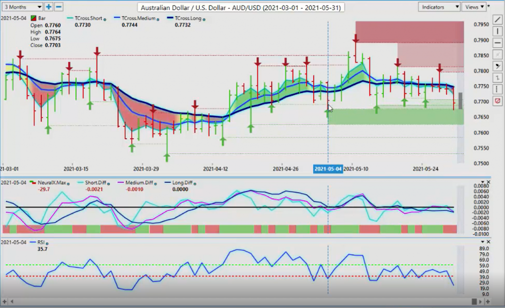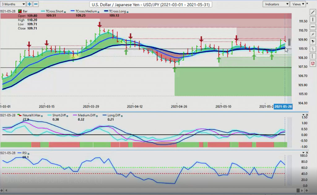 Now, the indicators from VantagePoint are mixed here, but again, the predicted differences are down. The neural index is down. Our RSI is at 49.6. But remember, we’ve got the Memorial Day in the US on Monday, a holiday short week. Be very, very cautious with this pair until at least Wednesday. Once the market has had a chance to settle or even midday Tuesday, once all markets are back in and we see if we’ve really got buyers on the Euro and not.