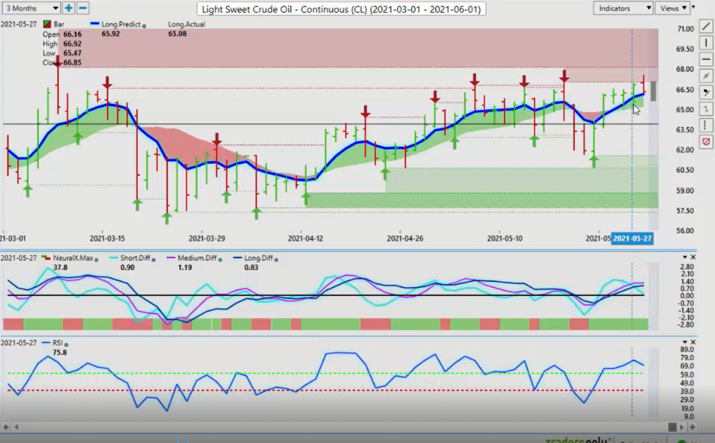 So we can see we’ve got our medium term crossing our longterm predicted difference. Our neural index remains a solid green. We’re holding above our T cross long at 6521. But the one you really want to watch here, guys, the key level is 6613, the long predicted. You can see that the market is using that VantagePoint predicted moving average as a pivot point actually for buyers to come back in.