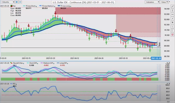 So if we can clear 90.22, the dollar may come off, but either way, the dollar usually does not have a great month in the month of June. So when we click on our F8 in our VantagePoint software, we do have a two-day close above the long predicted. Now, this is a two day rule that I’ve often discussed at some of the seminars in Tampa and the VantagePoint live training room. I don’t like to bite on the first time we move above this. I want confirmation that we’re holding above this.