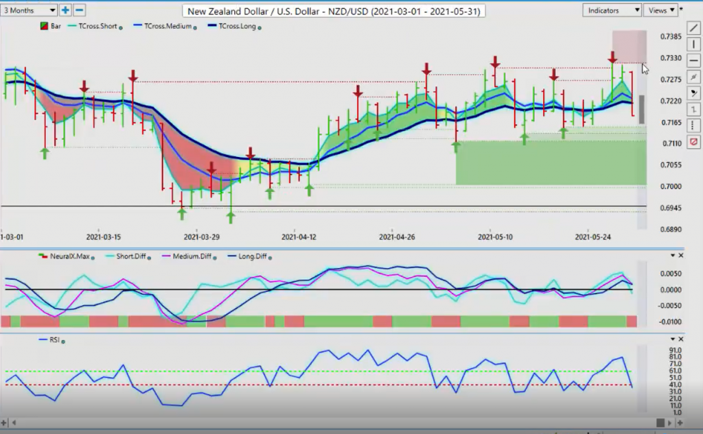 The Tuesday after the non-farm payroll number. In most cases, the dollar sells off either way, but in mid to late June, the dollar is at an even bigger susceptibility of a sell off. So keep that in mind. But the immediate move here is definitely up our medium term crossing, our longterm predicted difference. Neural index is positive, rising RSI. When we click on our F8, we’ve also managed to close above this.