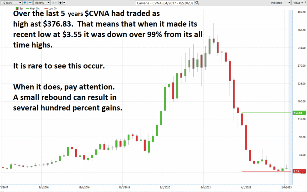 When $CVNA started showing life in early 2023 — despite losing 98% of its value — it became a prime candidate for a violent reversal. A beaten-down stock plus improving forecasts is the trading equivalent of spotting storm clouds with silver linings. We mentioned this in our March 2024 writeup and analysis and featured this graphic.