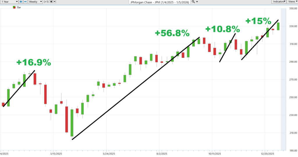 The first chart shows the best-case reality. This is what happens when JPM gets everything right for stretches of time — strong trends, shallow pullbacks, and sustained momentum. You see advances of +16.9%, +56.8%, +10.8%, and +15%, not as theoretical upside targets but as real, tradable moves that occurred. This is risk working in your favor. It’s the reward side of the equation, measured in dollars and percentages instead of hope and headlines.