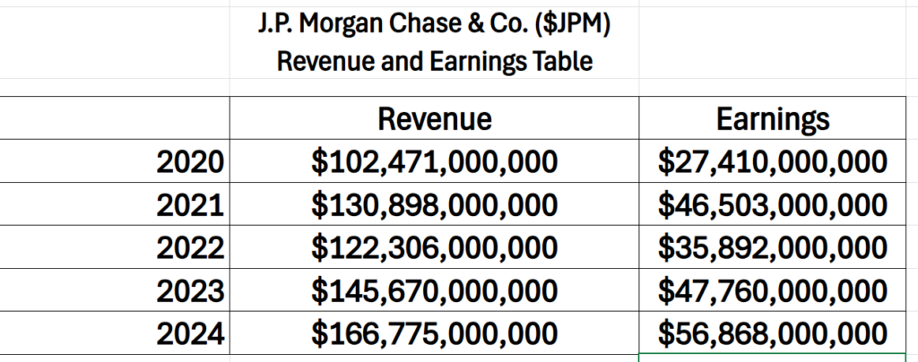 The table tells a quiet but persuasive story of scale, resilience, and compounding execution. From 2020 through 2024, JPMorgan Chase steadily expanded both revenue and earnings, not in a straight line, but in a way that reflects how large financial institutions operate through cycles.