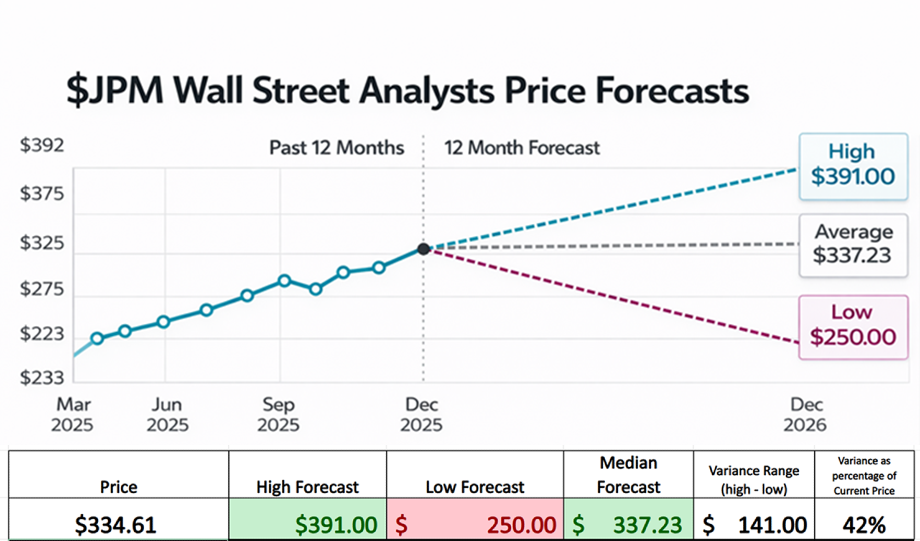 History agrees. The stock’s actual 52-week trading range runs from $202.10 to $337.25, a difference of $135.15, or about 40% of today’s price. Strip away narratives, forecasts, and sentiment, and the math is stubbornly consistent. Both realized volatility and expected volatility converge on the same conclusion: JPMorgan is unlikely to trade quietly. However 2026 unfolds — higher rates, lower rates, political risk, or economic resilience, the numbers suggest wide swings are not an anomaly but the baseline.