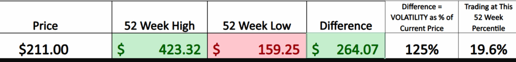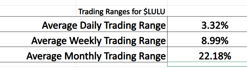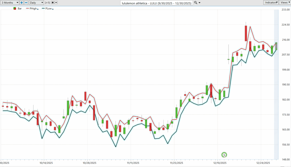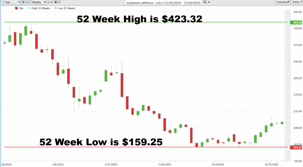 Together, these two boundaries form the stock’s annual trading range, and that range is more than just historical trivia. It is a real-world volatility benchmark. The distance between the high and the low shows how far the stock can travel when sentiment shifts. In Lululemon’s case, the range is wide, which tells you this is not a sleepy consumer staple. It’s a stock that reprices aggressively when expectations change. Traders use this range to size positions, set realistic targets, and manage risk. A move of $20 or $30 may feel dramatic day-to-day, but within a $260+ annual range, it’s context, not chaos.