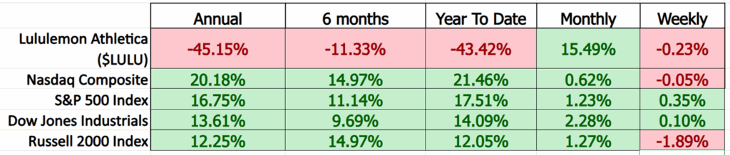 Next, we compare $LULU to the broader stock market averages: