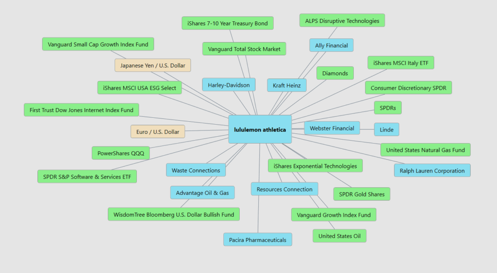 Now follow the connections out into commodities and energy. Cotton, oil, and industrial inputs don’t show up on a Lululemon balance sheet as line items, but they show up in margins fast enough to make investors nervous. When oil spikes, synthetic fabrics get more expensive. When agricultural prices jump, natural fibers follow. That’s why those links to energy funds, resource plays, and even gold matter. They’re not academic. They’re telling you whether input costs are becoming a headwind or a tailwind. When commodities cool, $LULU breathes easier. When they surge, pricing power gets tested and margins start doing gymnastics.