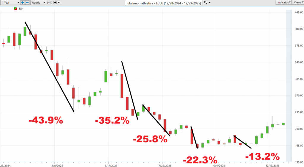 This 52-week chart of Lululemon Athletica tells a familiar market story, one that is less about fashion and more about psychology, expectations, and risk.