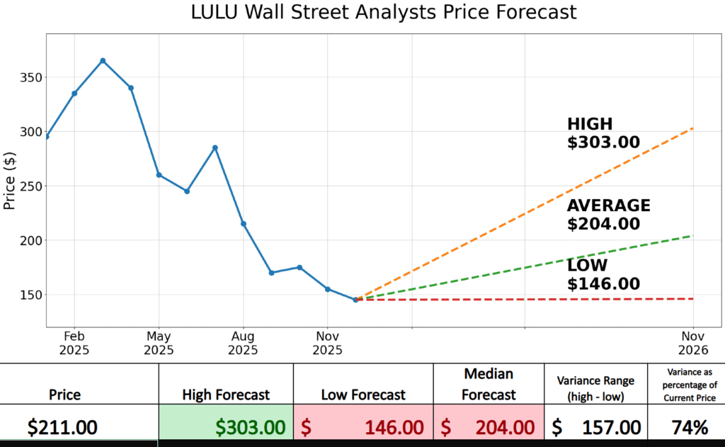 The $146.00 low forecast tells a different story. It reflects concern that demand normalizes, competition erodes differentiation, and the market permanently assigns Lululemon a lower multiple. This isn’t a collapse scenario. It’s a valuation reset argument, one that assumes excellence alone no longer guarantees premium pricing in a more cautious consumer environment.