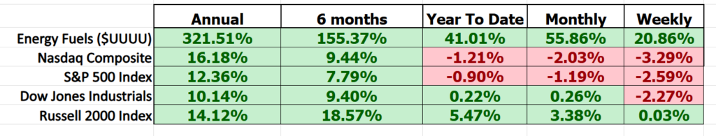 The table makes the message unmistakable. Energy Fuels ($UUUU) has not merely beaten the market, it has left it behind across every meaningful time frame. Annual performance north of 300 percent, six-month gains exceeding 150 percent, and solid strength year to date, monthly, and weekly all point to sustained leadership rather than a one off spike. In contrast, the major benchmarks are struggling to gain traction. The Nasdaq Composite, S&P 500 Index, and Dow Jones Industrials show modest gains over longer horizons and weakness over shorter ones. This is what true relative strength looks like. Capital is not drifting into $UUUU by accident. It is being directed there deliberately.