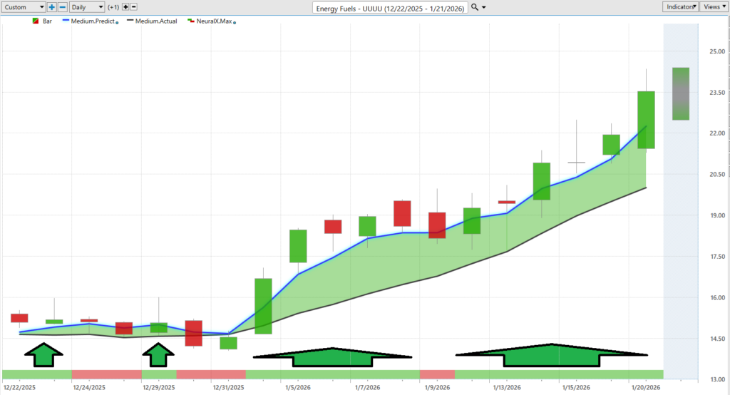 That context makes the recent action in $UUUU difficult to ignore. The most recent Up forecast occurred on 12/31/25. Since that signal, the stock has advanced roughly 60 percent in just a few short weeks. There were pauses along the way and moments of hesitation, but price respected the rising blue line throughout the move. This is exactly how the methodology is designed to work. Not by catching every tick, but by staying positioned while a meaningful trend unfolds and letting the numbers, not the noise, do the talking.