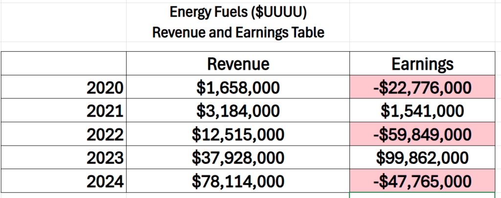 Finances are volatile. Look at this table and you can almost hear the gears grinding as Energy Fuels ($UUUU) forces its way uphill. In 2020 the company barely cleared $1.6 million in revenue and bled cash like a startup nobody believed in. Fast forward and the story changes fast. Revenues climb from $3 million to $12 million, then explode to nearly $38 million and over $78 million by 2024. That is not luck. That is a company deliberately stepping into bigger markets that require upfront spending, patience, and nerve. Earnings swing wildly along the way, from losses to profits and back again, because this is what happens when you build infrastructure before the payoff arrives. This table is not about smooth profits. It is about scale being built in real time. The revenue curve is the tell. Money is starting to flow through the business, even if it has not yet settled neatly at the bottom line. For traders and investors who understand how early-stage strategic plays develop, this is what the messy middle looks like right before the story gets simple.