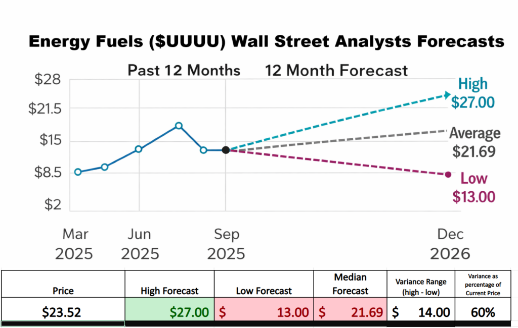 Wall Street analysts, bless their well-pressed suits and finely tuned spreadsheets, have once again gathered around Energy Fuels ($UUUU) to offer guidance. What they have produced is not consensus but a philosophical argument disguised as a forecast. One camp sees a future glowing at $27, another peers nervously down at $13, and the stock itself sits in the middle at $23.52, wondering who exactly is in charge here. This is not so much a prediction as it is a polite disagreement conducted with dollar signs.