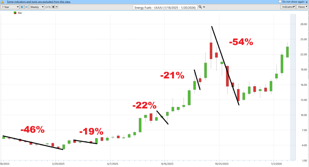 Volatility is often framed as something abstract and mathematical, but the best way to understand it is to start with what has already worked. The best-case chart shows $UUUU delivering uninterrupted advances of extraordinary size. We are talking about rallies of 100 percent, 224 percent, and even 237 percent without meaningful pullbacks. That is not noise. That is evidence of how aggressively this stock can trend once momentum takes hold. When conditions align, price does not creep higher. It accelerates. This is the upside potential that attracts capital and fuels conviction, and it sets a realistic ceiling for what strong trends in this name have historically looked like.