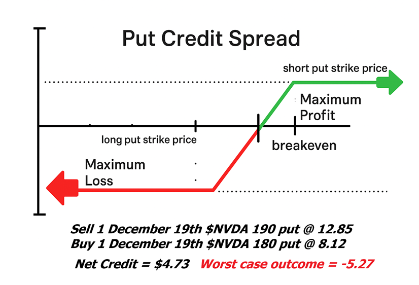 Think of a put credit spread like running a tiny rental business on time itself — you’re collecting rent (the $4.73 credit) from traders who are afraid the market will misbehave before December 19. Your job? Lease out that fear while it’s expensive. When premium is high, it’s like tourist season: everyone’s paying top dollar for the same stretch of beachfront. Selling a put spread at that moment means you’re charging peak-season rates. And the deal is simple — if NVDA stays above $190, you keep the entire $4.73. That’s your max profit, your full “rental fee.” If NVDA collapses to $180 or lower, you take the hit and pay out $5.30 — the cost of being on the hook if the storm really does come. Everything between now and December 19 is just watching the clock and letting time decay work for you. The strategy is clean, bounded, and honest: you know the most you can make, you know the most you can lose, and you’re literally selling time when buyers are willing to pay the most for it.