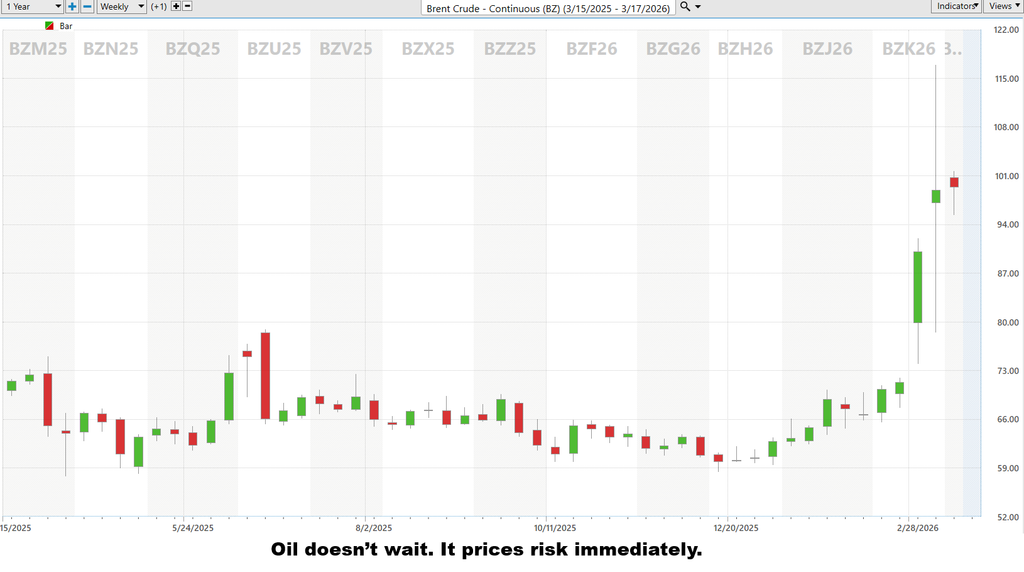 If Hormuz becomes unstable, oil does not drift higher. It moves fast. And because oil sits underneath transportation, manufacturing, and food production, that move ripples across the entire economy.