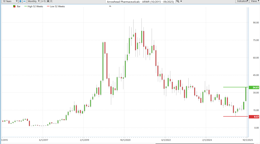Take a good look at the 10-year chart of $ARWR — it doesn’t look like a stock, it looks like a biotech electrocardiogram. Spikes, crashes, flatlines, and sudden jolts of life… the whole medical drama right there in green and red candles. That’s why you’ve got to zoom out. Only then do you see the bigger story: Arrowhead has always been volatile, but over the long haul the trajectory bends upward. Traders chasing short-term thrills see the heart attacks; investors who study the 10-year chart see the pulse of a company fighting its way forward.