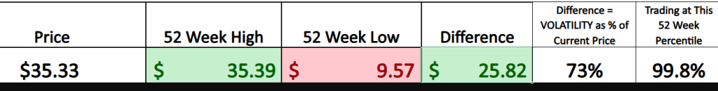 Look at these charts of Arrowhead Pharmaceuticals ($ARWR). The stock’s been to the bottom — $9.57, where hope was on life support — and it’s now clawed its way back to $35.33, brushing right up against the 52-week high of $35.39. That’s a difference of nearly 73% volatility baked into the current price. And where’s it trading? Practically on the ceiling. At the 99.8th percentile, this thing isn’t just knocking on the door, it’s kicking it down.