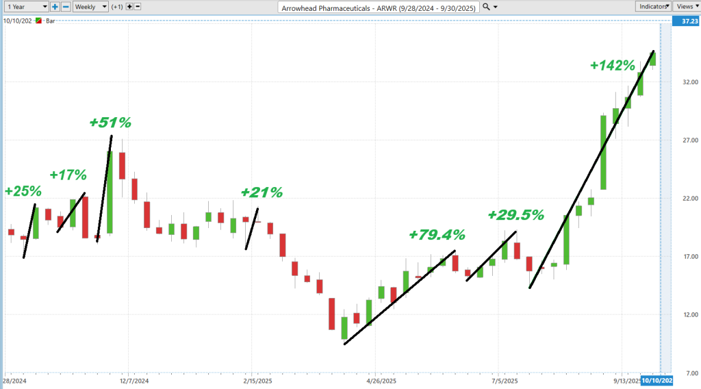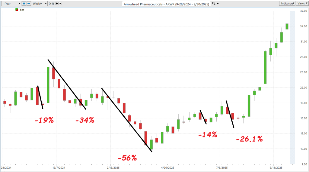 When you look at these next two charts of Arrowhead Pharmaceuticals, what you see is the essence of volatility laid bare. In the past year, ARWR has been capable of breathtaking rallies — up more than 142% in a single stretch — while also suffering punishing declines, with one selloff wiping out 56% of its value. These are not abstract numbers on a spreadsheet; they are the lived reality of trading biotech, where the swings are as dramatic as the science behind the drugs.