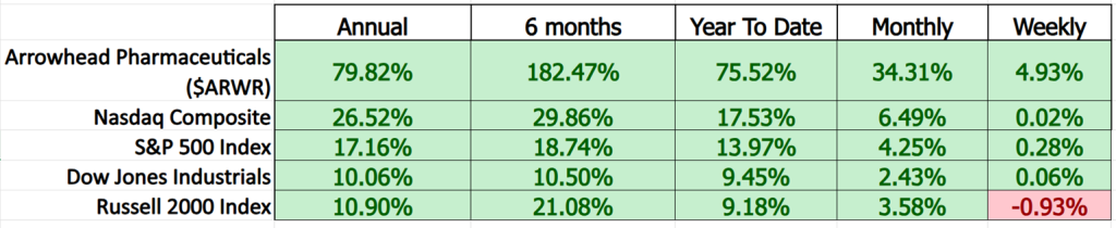 If you really want to know what kind of beast you’re trading, you can’t just glance at one number and call it a day — you’ve got to drag the thing into the light and poke it from every angle. That’s what this performance grid does for Arrowhead Pharmaceuticals ($ARWR). Over the past year it’s up nearly 80%, which already makes the Nasdaq, the S&P, the Dow, and the poor Russell 2000 look like they’ve been napping through homeroom. But zoom into six months and ARWR is up a ridiculous 182%. That’s not performance — that’s a biotech rocket strapped to caffeine.