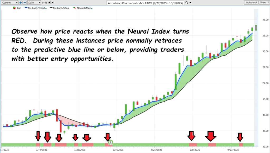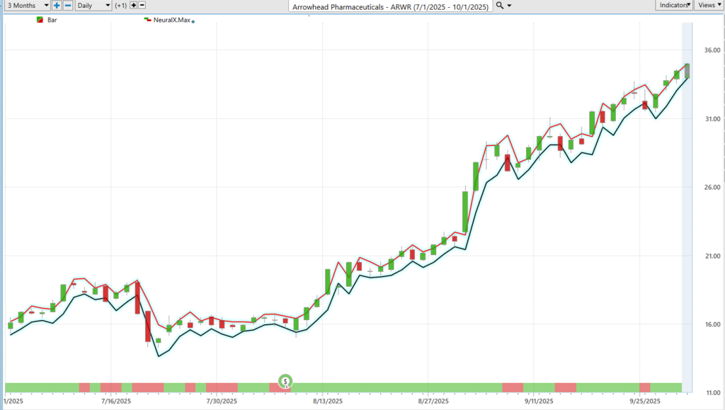 But in early August, the narrative flipped. The blue line turned up, crossed decisively above the black line, and never really looked back. From that moment, $ARWR entered a steady climb, with the A.I. keeping traders in the trade despite the inevitable pullbacks. The predictive model navigated the volatility by filtering out the noise — holding long through August and September as the stock went from the low 20s to the mid-30s. That’s the power of the signal: not eliminating risk but keeping traders aligned with the prevailing trend when emotions might otherwise shake them out.