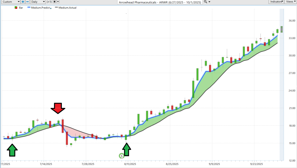 Now look at the last three months of Arrowhead Pharmaceuticals ($ARWR). This chart reads like a textbook case of what the blue line is built to do. In early July, the predictive line began to roll over, dipping beneath the actual average just as the stock stumbled, warning of short-term weakness. That stretch in mid-July into early August was choppy, red candles piling up, and the A.I. stayed defensive — signaling caution as the stock searched for a floor.