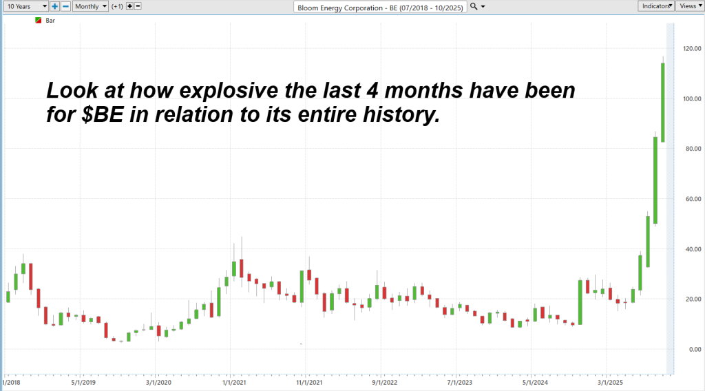One of the most powerful setups in trading is finding stocks making new 52-week and 10-year highs at the same time. That’s where strength stops being coincidence and starts becoming confirmation. Look closer at Bloom’s long-term chart, and you’ll see exactly that dynamic unfolding. For four months straight, the stock hasn’t just been rising; it’s been breaking out, climbing step by step into price territory it hasn’t seen in a decade. Those moves don’t happen in isolation — they happen when Wall Street wakes up to a new narrative, one that suddenly feels urgent.