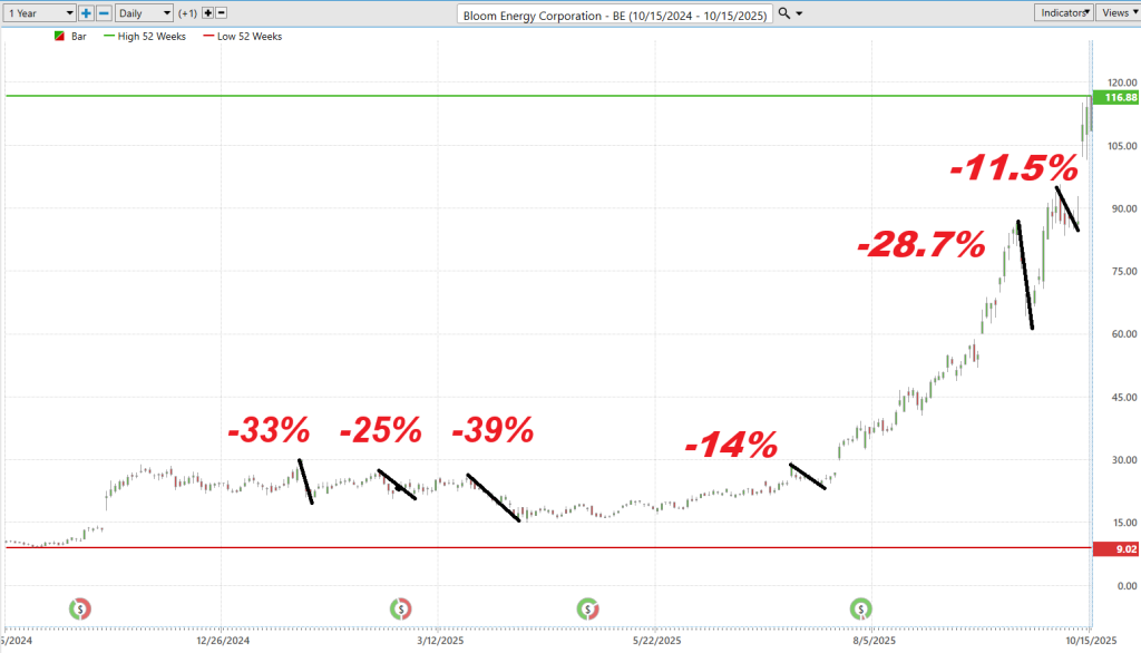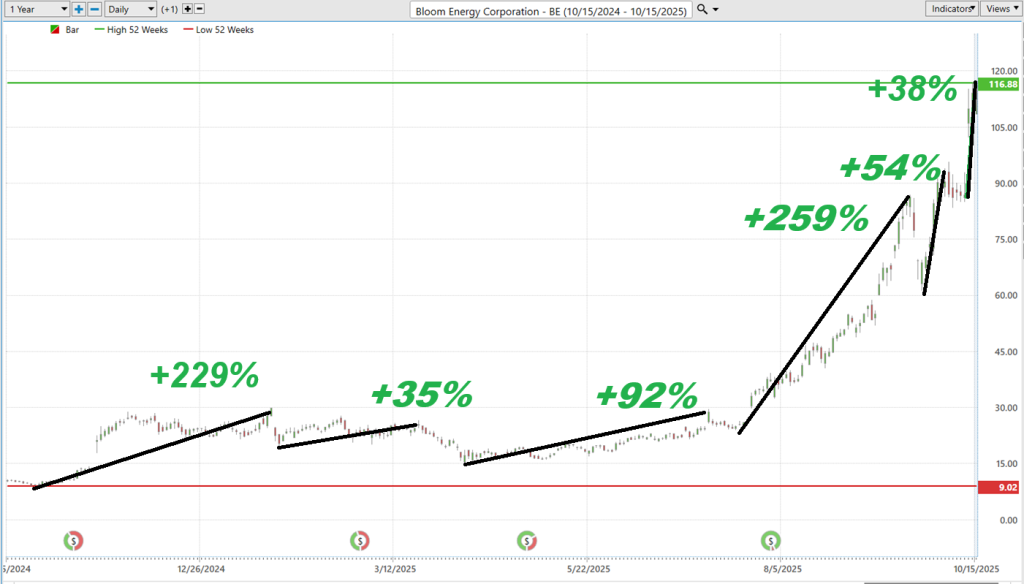 Now, take a look at Bloom Energy ($BE). The first chart tells a story of explosive rallies — gains of +229%, +35%, +92%, +259%, +54%, and +38% — each surge marking a new wave of momentum, each one bigger than the last. It’s the portrait of a stock under accumulation,