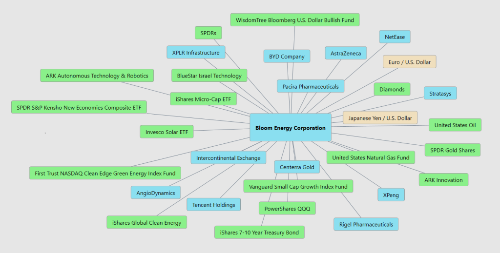 Now, the attached intermarket analysis graphic paints a broader picture of how Bloom Energy sits at the intersection of multiple financial ecosystems. Connected to ETFs like ARK Innovation, Invesco Solar, and First Trust Clean Edge Green Energy, it rides the same capital flows that power the clean-tech movement. Its correlations with U.S. Dollar, Gold, Natural Gas, and even Treasury Bonds reveal how sensitive the company can be to shifts in inflation, interest rates, and commodity cycles. Notice also the ties to BYD, XPeng, and Intercontinental Exchange — seemingly distant names that hint at the global web of supply, demand, and investment sentiment influencing Bloom’s price action.