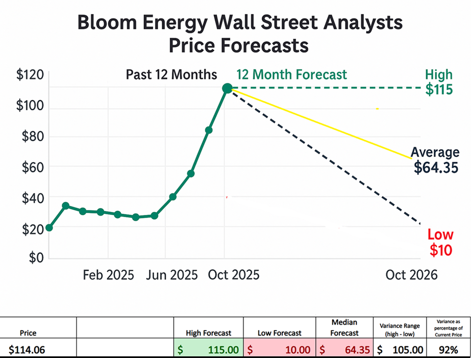 Look at that chart. Eighteen analysts, each paid to see the future, and they can’t even agree on which direction the rocket’s pointing. The average target for Bloom Energy sits at $64.35, a number that looks calm and sensible until you peek under the hood. The bulls are screaming $115, while the bears are whispering $10, and that $105 gap between them isn’t a typo — it’s a confession. It says loud and clear: volatility is the name of the game.