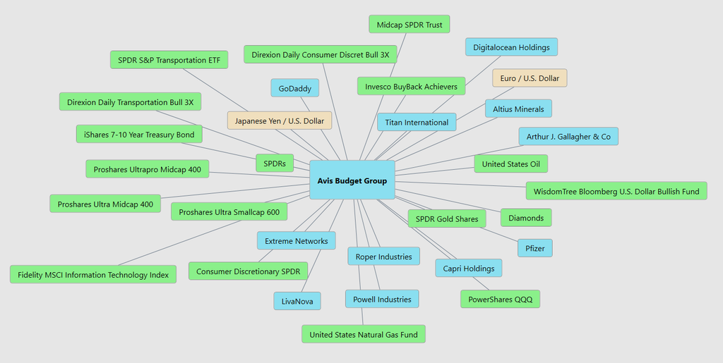 What jumps out immediately is that $CAR is not moving in isolation. It is sitting at the center of a very broad and diverse network that spans transportation, consumer discretionary, midcap equities, and even macro influences like currencies and commodities. That kind of connectivity tells you this is not a one-variable story. It is being influenced by multiple layers of the market at the same time, which typically points to a move that has deeper roots than just short-term speculation.