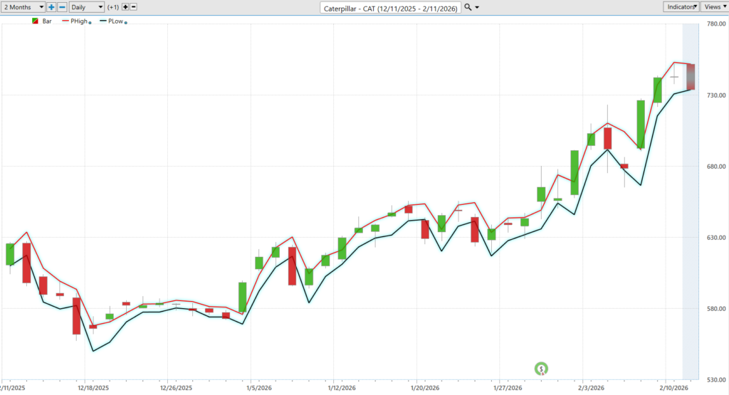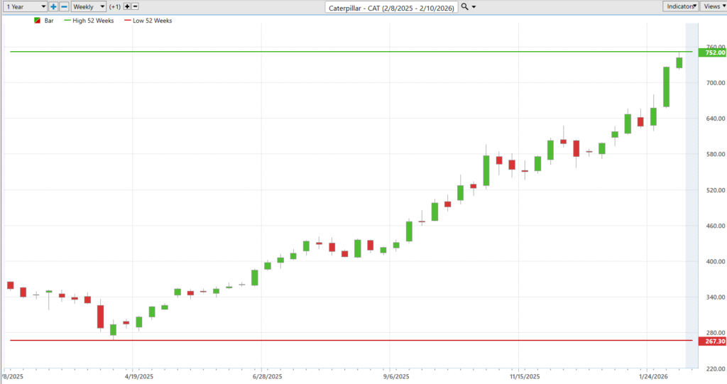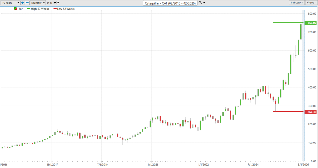 What is striking, however, is not just the magnitude of the swings but the direction of travel. Over the past year, CAT has methodically climbed to new 52-week highs and, more broadly, new 10-year highs. On the long-term chart, each breakout has marked the stock’s ability to clear prior ceilings that once defined its limits. Markets are not sentimental. When a stock repeatedly makes new highs, it is effectively voting to reprice the company’s prospects upward. It suggests that prior concerns, whether cyclical slowdowns or margin compression, have been absorbed and overcome.