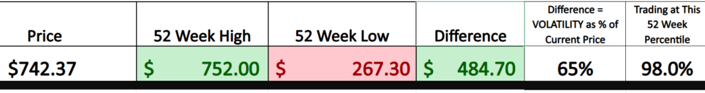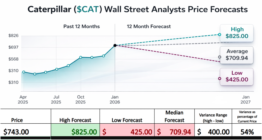Caterpillar’s annual trading range now spans roughly 65% of its current price, a statistic that deserves more attention than it typically receives. That figure, derived from the distance between the 52-week high of $752 and the 52-week low of $267.30, is not just a historical footnote. It is a measurement of realized volatility. It tells us how far this stock has been willing to travel in the past year. When we place that beside Wall Street’s forward projections, which imply a slightly narrower but still substantial range, a clear message emerges. Both history and consensus expectation suggest that CAT is not a sleepy industrial name. It is a stock defined by movement.
