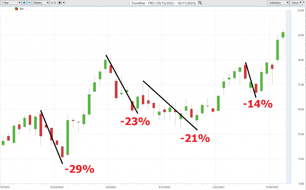 #3 – Let’s talk about what really gets traders’ hearts racing – those stocks that go on wild rides, the ones with the kind of swings that keep you on the edge of your seat. Now, when it comes to Frontline PLC, ticker symbol $FRO, it fits that bill just fine.
