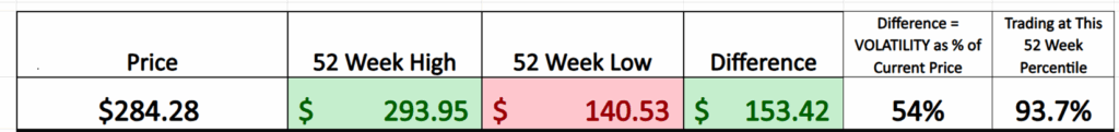 The second graphic quantifies the madness. The 52-week high sits at $293.95. The 52-week low lurks all the way down at $140.53. The difference between those numbers is $153.42, which amounts to a 54 percent swing based on the current price. And if a 54 percent range doesn’t qualify as “volatility,” then neither do roller coasters, hurricanes, or family reunions.
