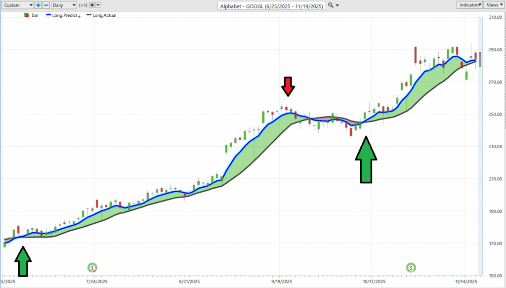 For managing a portfolio, this type of guidance becomes indispensable. The Daily Range Forecast doesn’t eliminate volatility — it helps you navigate it. It highlights where risk intensifies, where opportunities emerge, and where price action is likely to retrace or extend. In a market environment where Google is offering sizable swings and rapid shifts, having a model that outlines tomorrow’s expected trading envelope gives traders the structure they need to size positions appropriately, tighten or widen stops intelligently, and manage exposure with confidence.