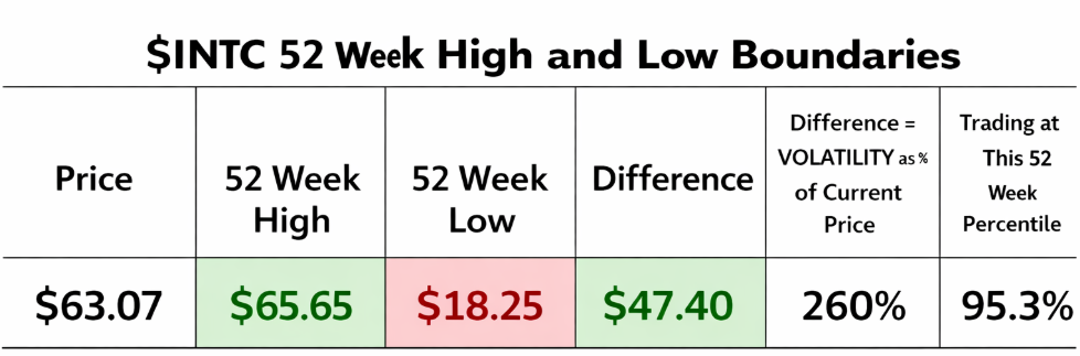 This is not a calm stock. This is a stock that has already proven it can move 260% inside a single year. That is not volatility. That is extreme movement. Intel has gone from a deeply discounted, left-for-dead name to something traders are now chasing near the highs. When a stock shows you that kind of range, it is telling you exactly what it is capable of doing in both directions.