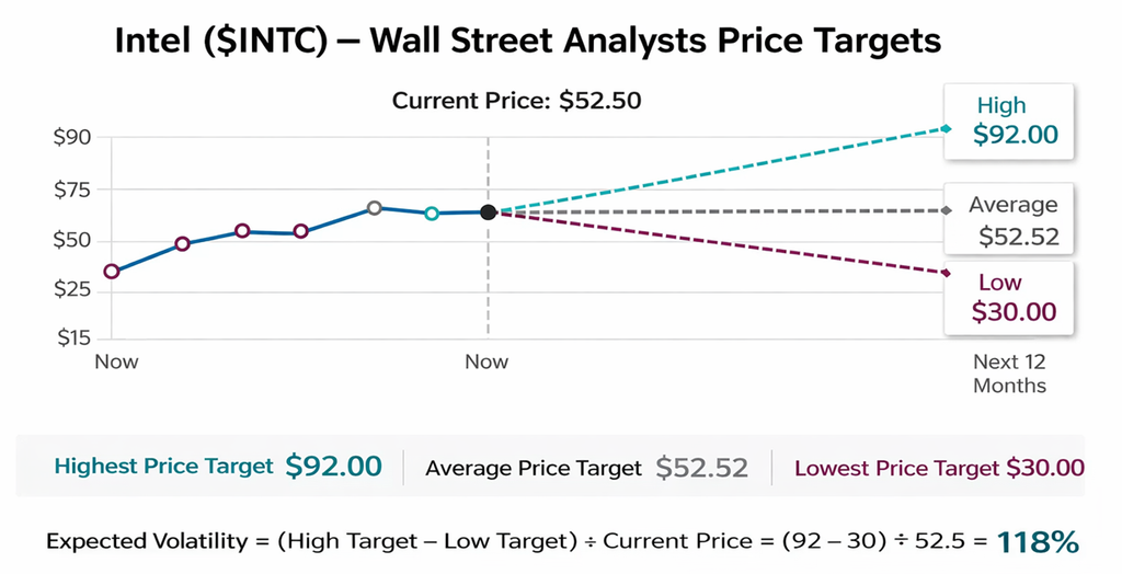 A 118% expected volatility range tells you everything you need to know. Wall Street is not aligned. One camp believes Intel is on the verge of a full-scale comeback with manufacturing dominance and AI relevance. Another camp sees a capital-intensive turnaround that could stall under its own weight. When analysts are this far apart, it is not insight. It is uncertainty with a price tag attached.
