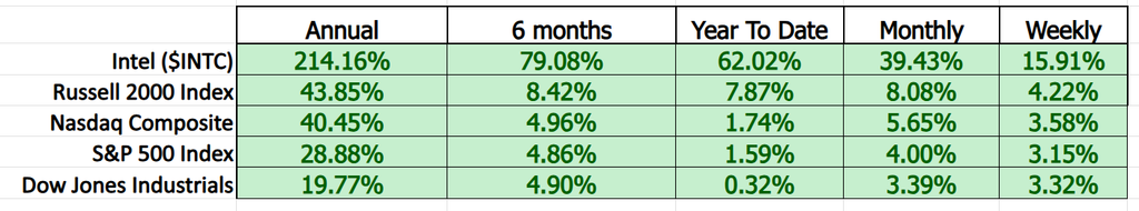 That leadership is not confined to one timeframe. Over the past six months, Intel is up +79% while every major index remains in the single digits. Year to date, Intel has gained +62%, while the S&P 500 and Nasdaq are barely positive. Even at the monthly and weekly levels, Intel continues to lead with +39% over the past month and +15.9% over the past week, consistently outpacing every benchmark. This is not a one-time surge. This is persistent relative strength across all timeframes.