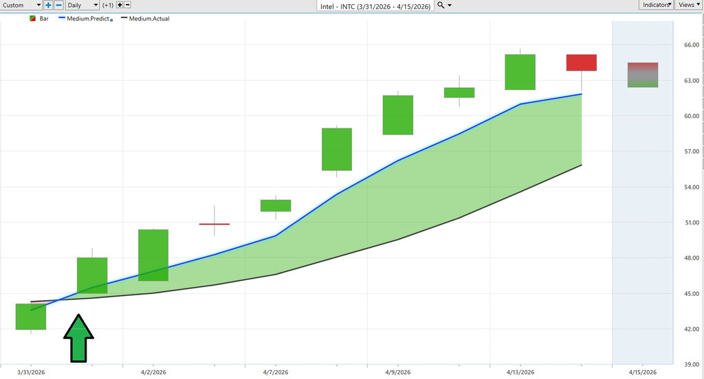 The real takeaway is not just that Intel is moving higher. It is how it is moving higher. When the predictive blue line leads and price follows, it creates a framework where traders are not reacting to price alone but positioning around expectation. As long as that slope continues upward and the relationship between the two lines remains intact, the trend remains constructive. The moment that relationship compresses or reverses, that is when the signal changes. Until then, the data is pointing in one direction, and the market, for now, appears to be following it.