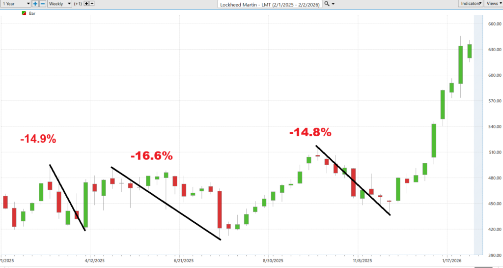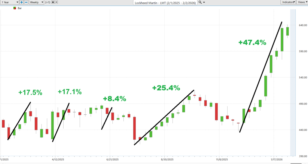 For traders, Lockheed Martin is best suited to those who respect trends but understand catalysts. The stock works when defense spending remains predictable and contract execution stays on schedule. Early warning signs would include funding delays, margin compression, or negative revisions tied to program execution rather than headlines.