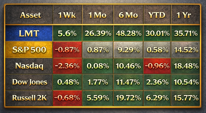 Look at the context. The S&P 500, Nasdaq, Dow Jones, and Russell 2K are all doing what broad markets tend to do. Some green here, some red there, progress that depends heavily on timing and patience. $LMT, by contrast, is behaving like an asset with its own gravity. A 26% move in one month. Nearly 50% over six months. Over 30% year to date. These are not index-like returns. These are leadership returns.