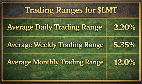 Now place that precision beside the chart of $LMT’s historical movement, the tidy little reminder that this stock tends to travel about 2.20% daily, 5.35% weekly, and 12% monthly when left to its own devices. Suddenly the future is not a foggy battlefield but a mapped hiking trail with elevation markers. You begin to see why professionals stop asking whether price will go up or down and start asking the only question that keeps the lights on: how far can it reasonably move? Because distance, not direction alone, is where the profit hides… and where discipline stops gambling from wearing a necktie and calling itself strategy.