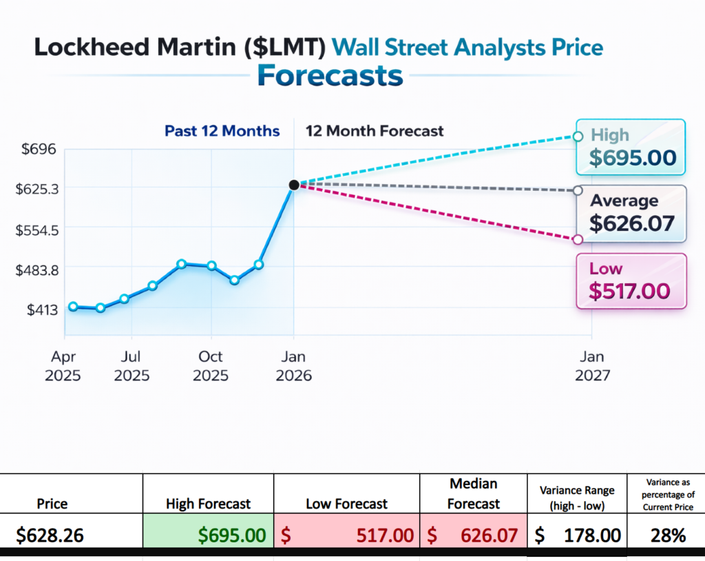 Fifteen Wall Street analysts have taken their best swing at predicting Lockheed Martin, producing a tidy little consensus that looks calm until you read the fine print. The average 12-month price target comes in at $626.07, which sounds reassuring in the way a weather report does right before you pack the wrong jacket. The most enthusiastic optimists see the stock climbing to $695.00, while the pessimists, ever loyal to their inner gloom, see it drifting down toward $517.00.