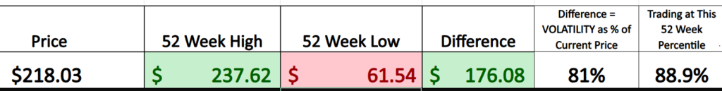 We’re looking at the annual trading range here. High of $237.62, low of $61.54. That’s a spread of $176.08 — which is basically a full personality disorder in price form. Then you divide that $176.08 by today’s price, $218.03, and discover this thing has been swinging around at 81% volatility.