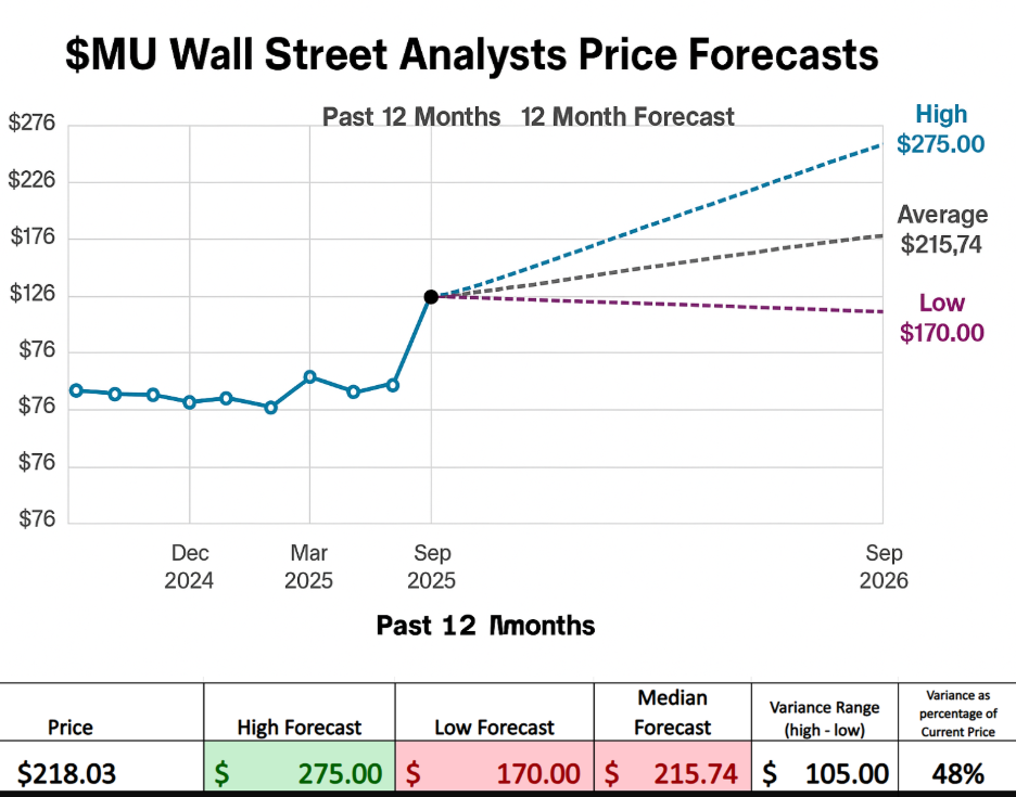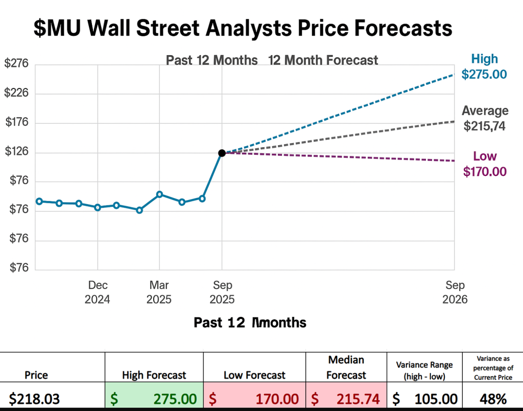 Look at $MU. The most optimistic forecast sits at $275, while the most cautious calls for $170. That’s a gap of $105, or roughly 48% of the current price. That variance doesn’t come from guesswork; it comes from different interpretations of the same data — earnings trends, demand cycles, and global chip dynamics. The analysts all see the same company, yet their price targets stretch across a canyon of uncertainty.