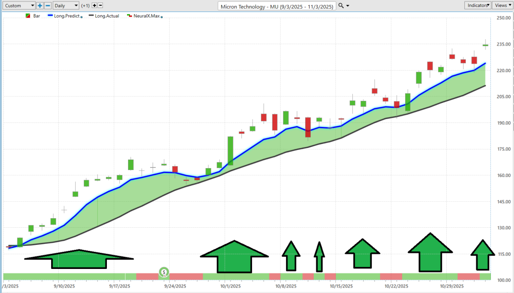 Now take a look at the second chart — the Daily Range Forecast — those tidy little projected highs and lows that appear as if the market suddenly got manners. This is where things stop being philosophy and start becoming tradeable reality. Because even though Micron swings around like a caffeinated rodeo horse, the daily range forecast gives you a sense of where buyers are likely to step in and where sellers might start making trouble. In other words: the edges. And edges are where traders live, profit, curse, and refill their coffee. Without a framework like this, trading volatility is just gambling with better stationery.
