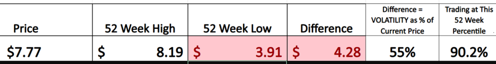 Now here’s the punchline that should make traders sit up in their seats: that $4.28 gap represents 55% volatility based on the current price. That’s the stock market equivalent of a roller coaster that requires a seatbelt and possibly a signed waiver. And that’s not some manufactured statistic from an options pricing model, either. That’s what the market actually did over the last 52 weeks.