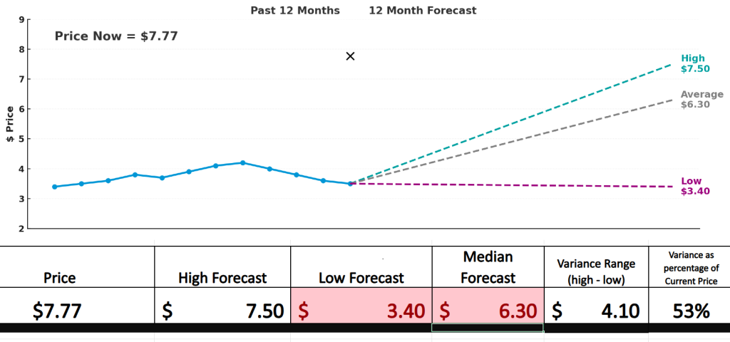 Here’s the punchline: you take the high forecast, subtract the low forecast, and that’s your forward battleground. In this case, the spread comes out to $4.10. That’s 53% of the current price. Which means? The market is gearing up for a fight. A big one. A bucking bronco of potential movement that could yank your account into glory or face-plant it into the dirt if you’re not strapped in tight.
