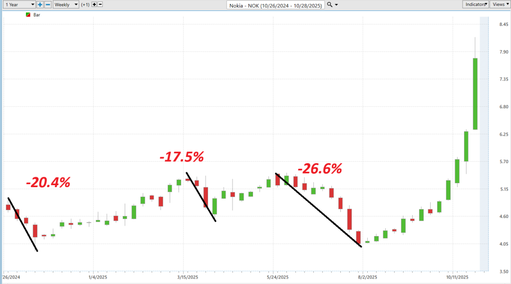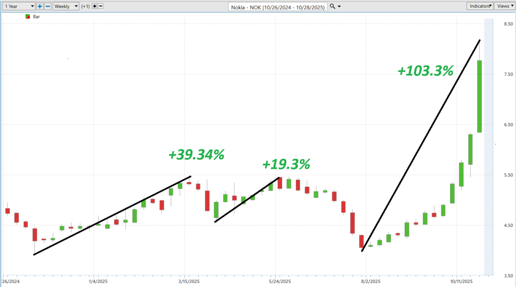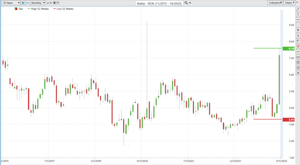 Over the past year, the Nasdaq’s impressive rally has been driven by AI leaders and cloud titans, yet Nokia more than doubles that performance. The S&P 500 — home to the most powerful corporations in the world — looks almost sleepy by comparison. Even in the monthly and weekly snapshots, where volatility can distort trends, Nokia’s momentum remains pronounced and consistent.
